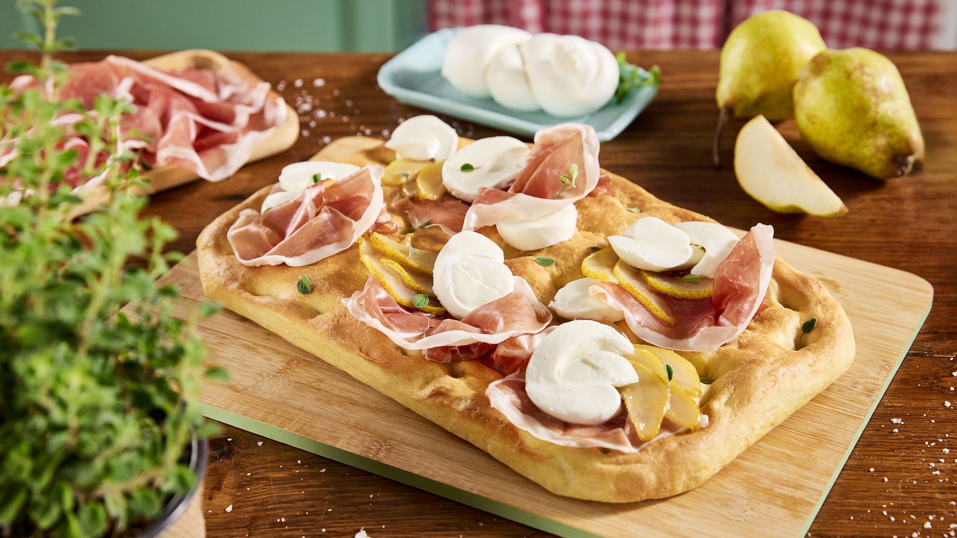 Focaccia calda con Mozzarella di Gioia del Colle DOP, prosciutto crudo e pere caramellate