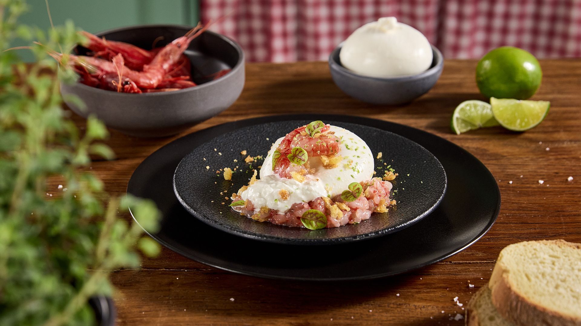 Burrata di Andria IGP e gambero rosso crudo, croccante di pane e note agrumate