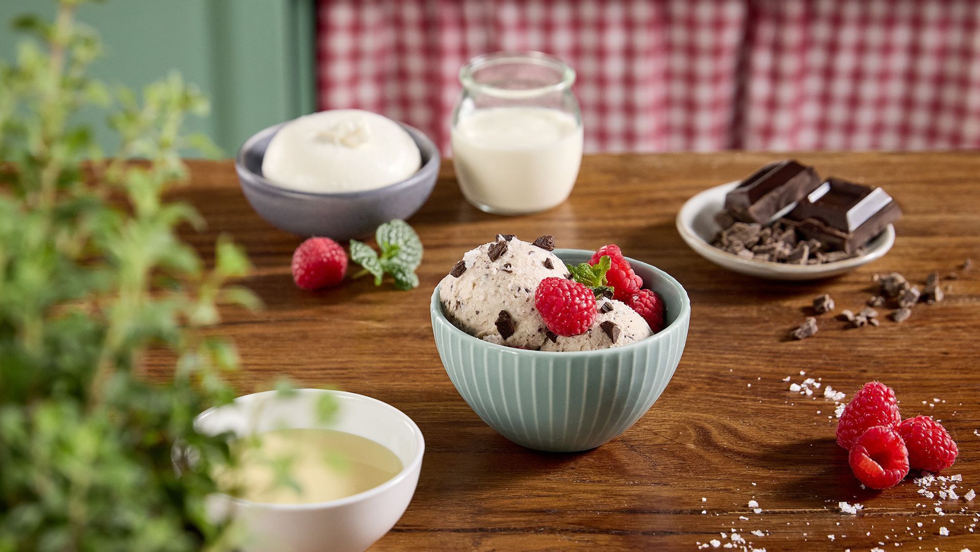 Gelato di Burrata di Andria IGP con lamponi freschi, scaglie di fondente e sale Maldon