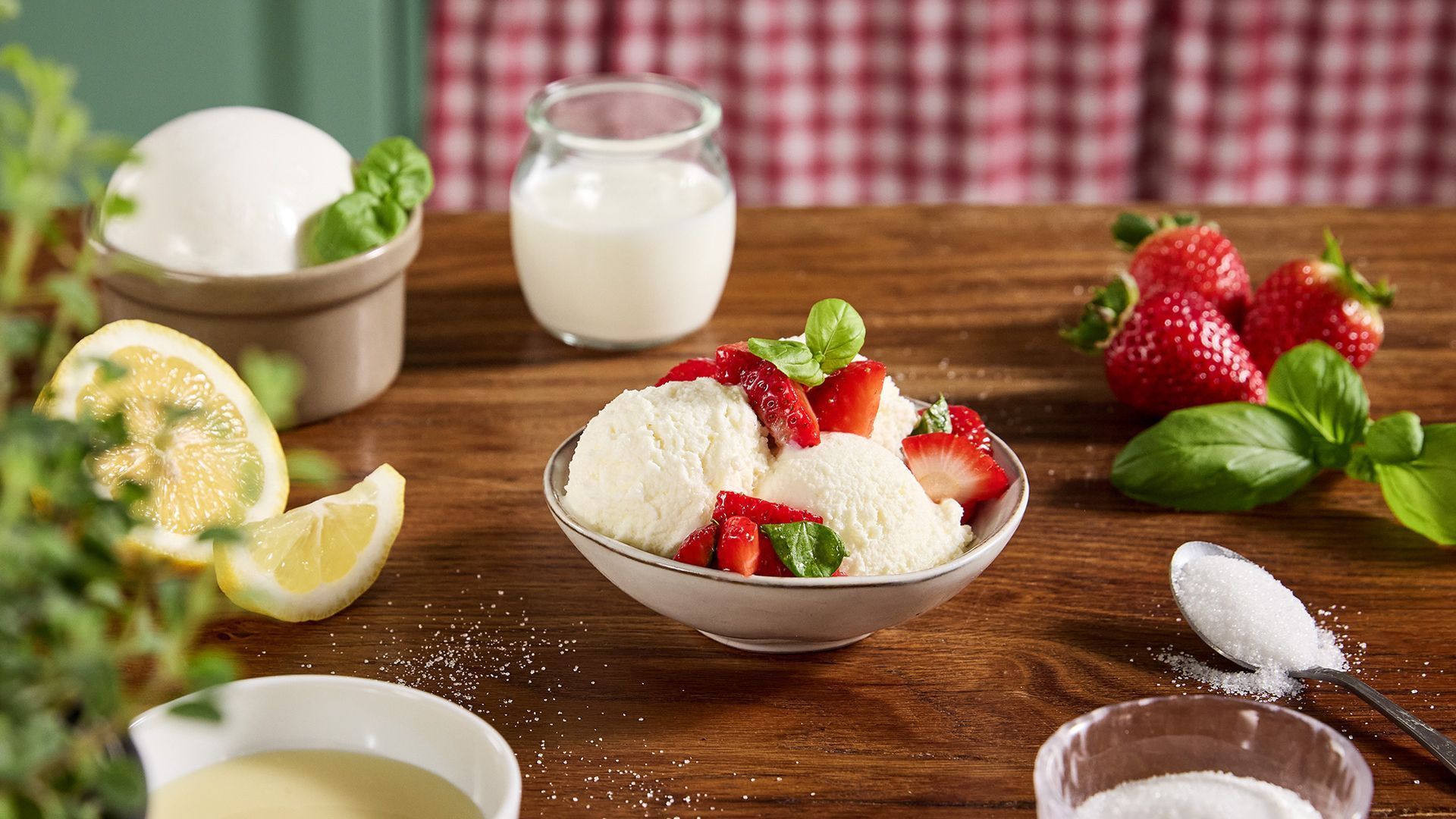 Gelato cremoso alla Mozzarella di Gioia del Colle DOP con fragole e basilico