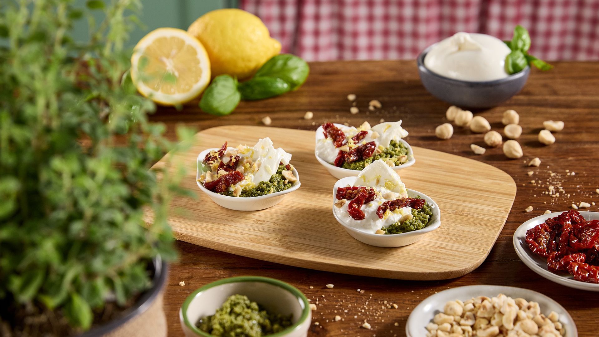Burrata di Andria IGP al cucchiaio con pesto di basilico, nocciole tostate e limone