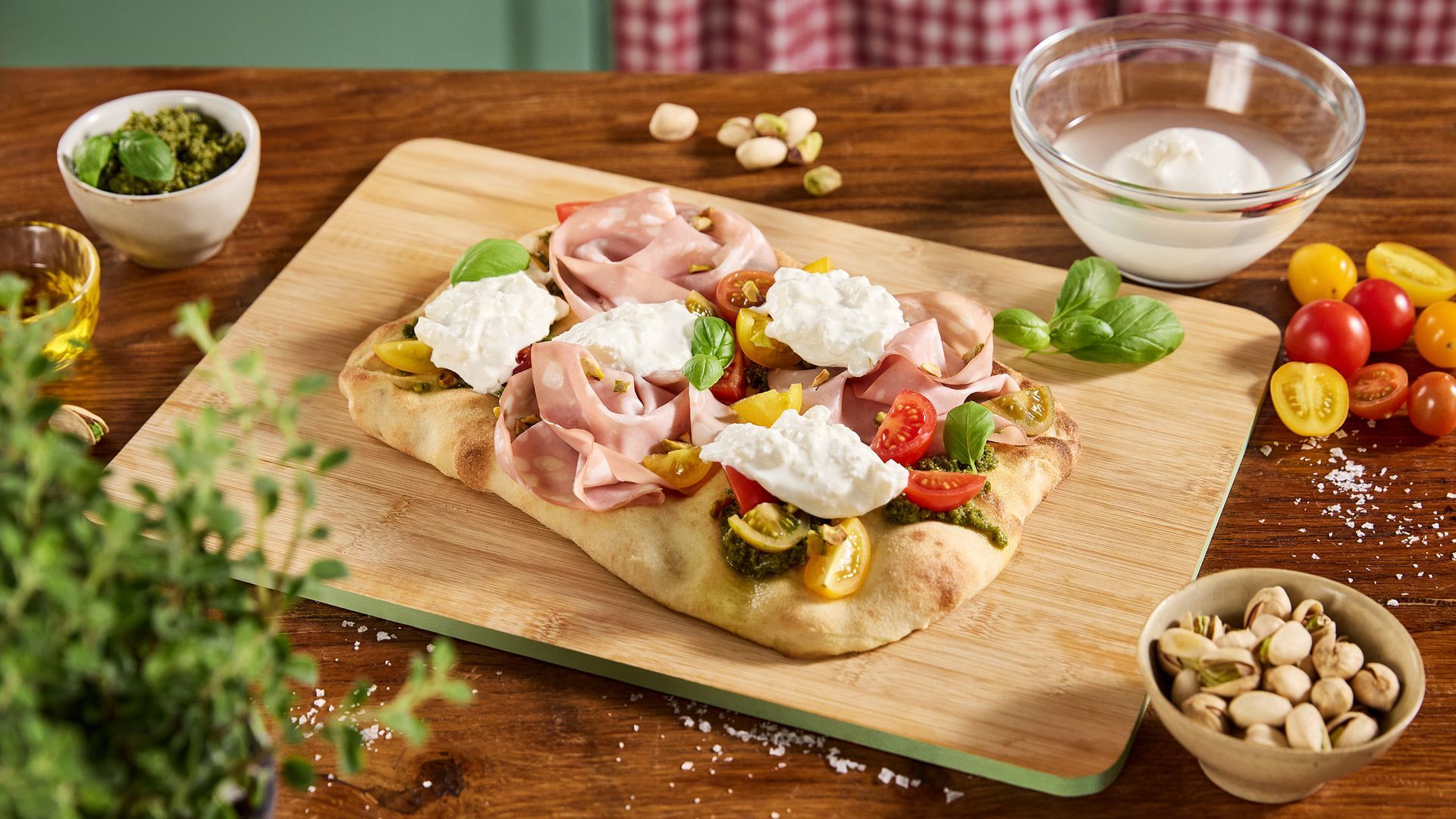 Pinsa al pesto con mortadella, Burrata di Andria IGP cremosa