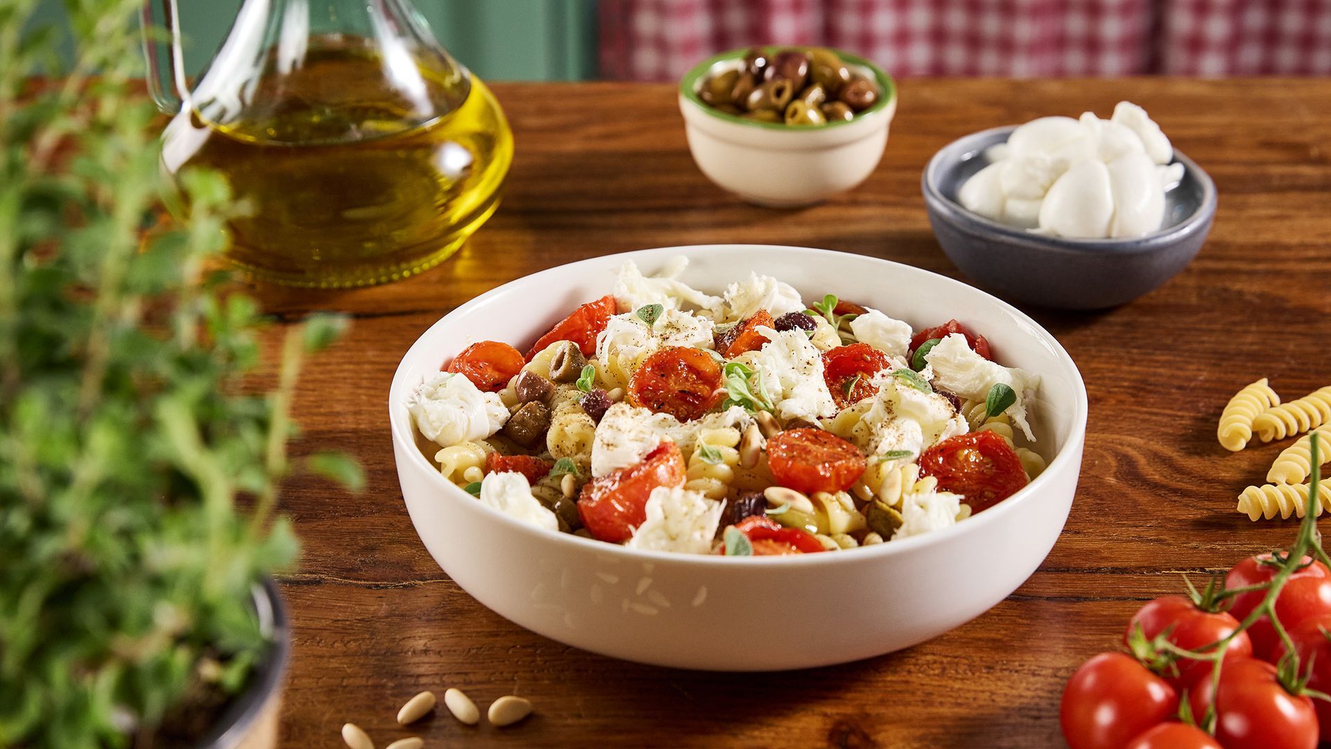 Insalata di pasta gourmet con nodi di Mozzarella di Gioia del Colle DOP , pomodorini arrosto e pinoli tostati